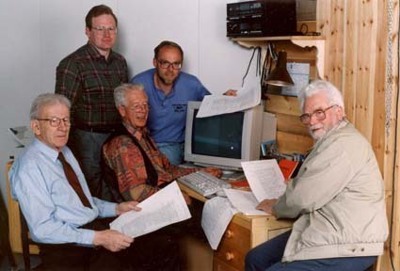 Datagruppa til Oppdal historielag gjorde virkelig et storarbeid da kirkebøkene for Oppdal og andre sentrale kilder ble lagt inn på data i første halvdel av 1990-åra. Her er gruppa i arbeid, fra venstre Ivar Hoel, Magne Nilssen, Odd Magne Mellemseter (bak), Tore Fagerhaug og Arnt Tilset.