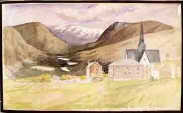 "Opdal Prestegaard og Kirke 1873" er tittelen på denne akvarellen, laget av den kjente kunstneren Edvard Diriks.